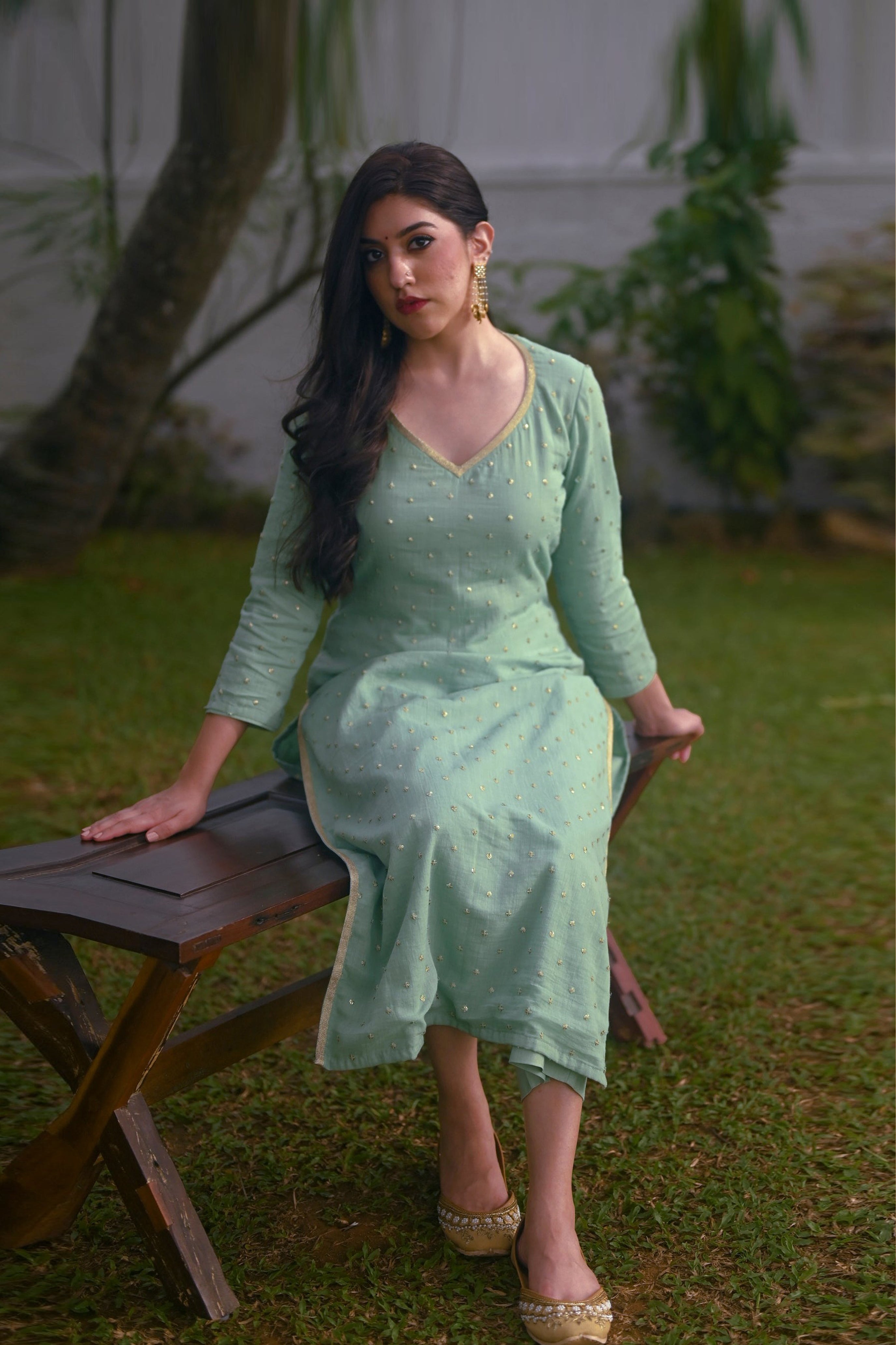 Celebrate in style with this pastel green minimal festive wear kurta made from sequined cotton fabric.