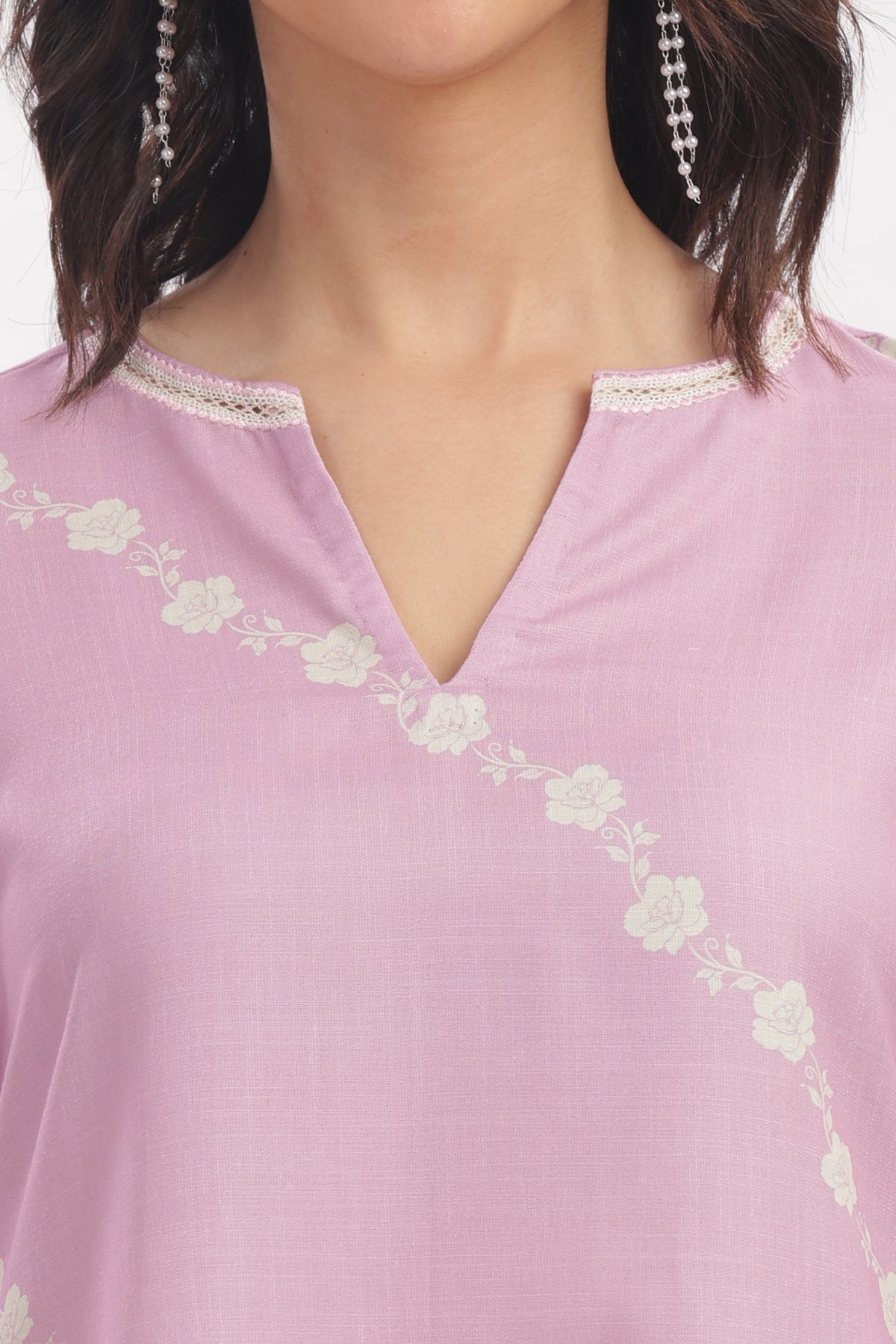 Pink floral printed linen cotton short kurta blends everyday ease with a refined touch. Designed with a close neckline that opens into a V cut, this kurta features delicate floral prints and border detailing on the slit and sleeves. Crafted from soft linen, it offers effortless comfort and understated charm.