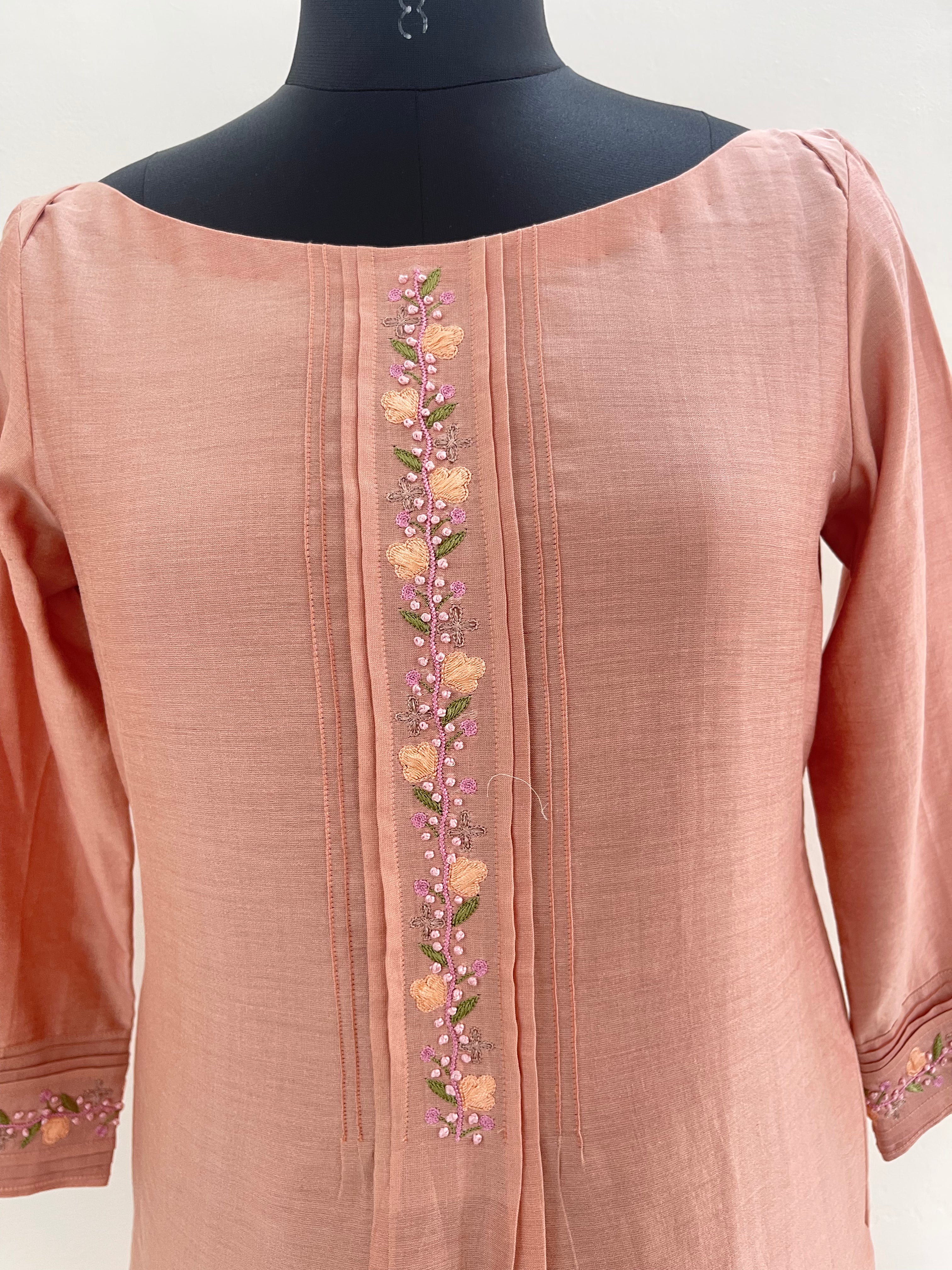 Dress to impress in this peach chanderi silk kurta with floral embroidery