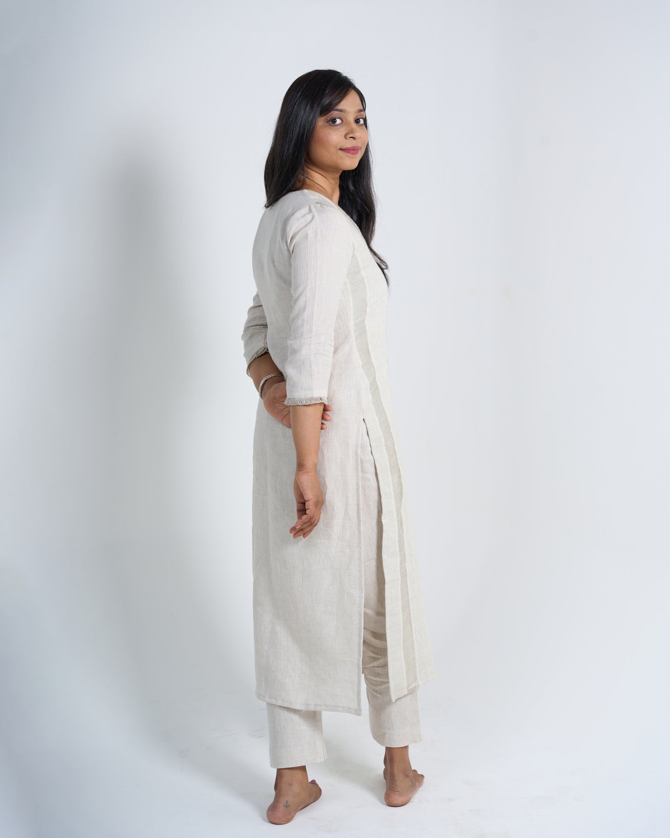 Turn heads with this stunningly beautiful off white kurta made from linen fabric