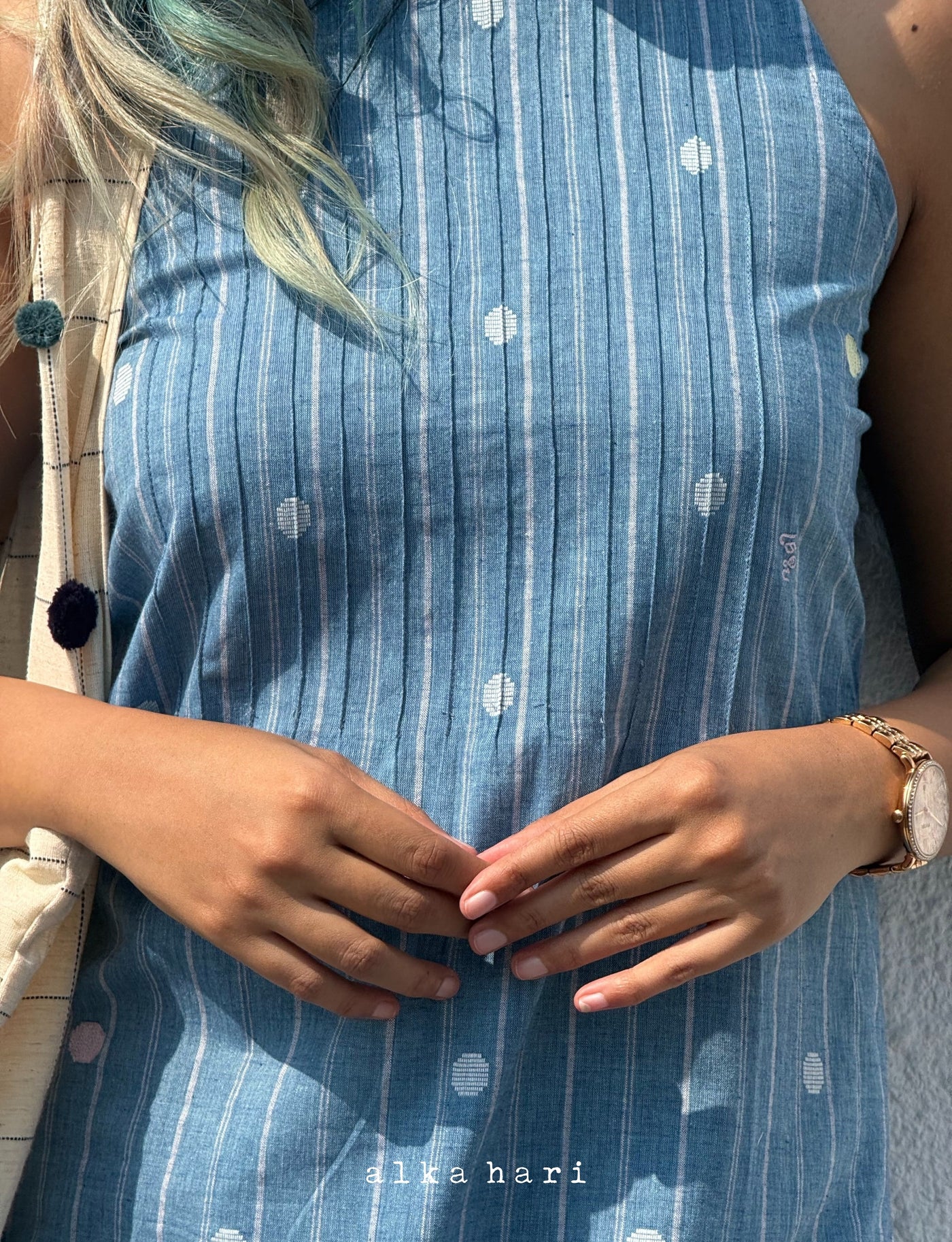 Blue Embroidered Dress with Tucks